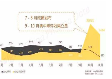 此外,CDE对于重复申报的相同品种进行集中审批。9月7日,1576个新报受理号开始专业评审,9月30日1173个受理号新报任务开始专业评审;10月份审评完成的受理量达到2000多个。11月11日,CFDA发布药审改革公告,集中审评走上正轨,此前受理的相同品种都会列入集中审评。
