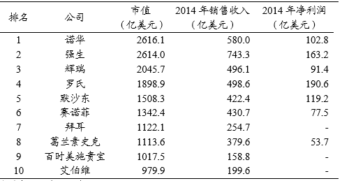2015年全球顶尖的制药企业中,诺华以2616.1亿美元的市值排在榜首,紧随其后的辉瑞、罗氏、默沙东等大型制药企业的市值也都在2000亿美元左右(强生还有制药之外的其他业务,所以未做比较),折算成人民币约在15000亿人民币。