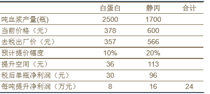 由于各厂家的小制品占比都不同,我们暂时只考虑白蛋白和静丙的提价带来的利润增厚,对于具体企业的提价影响,则放在后文再测算。我们测算,血液制品提价后,每吨血浆将增加净利润24万元左右,按一般血制品企业吨浆净利润90万元左右测算,净利润提升比率25%以上。
