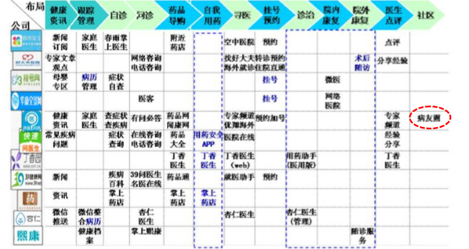 中为认为一个典型的重度垂直的互联网医疗商业模式应该包含健康资讯和健康教育课程、疾病查询、在线问诊、医药电商、预约挂号、院内服务、院后康复随诊、患者交流社区、可穿戴设备持续监测等诸多环节(如果不是自建,至少应该成为对接这些服务的入口平台)。