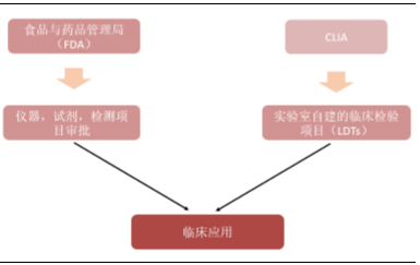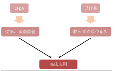 国内的基于基因检测的液态活检项目进入临床也实行双重监管,所有仪器设备,试剂归CFDA报批管理,临床实验归属卫计委管理。这与美国CLIA认证制度类似。即要求试点单位内部有严格的质量控制,并且相关工作人员需经培训合格上岗,则不受CFDA对仪器和试剂的注册限制。根据CFDA在2014年1月公布的《食品药品监管总局办公厅关于基因分析仪等三个产品分类界定的通知》,基因测序诊断产品(包括基于测序仪及相关诊断试剂和软件),符合医疗器械的定义,应作为医疗器械管理,其中测序反应通用试剂盒(测序法)划为I类医疗器械管理产品,基因测序仪作为III类医疗器械管理。