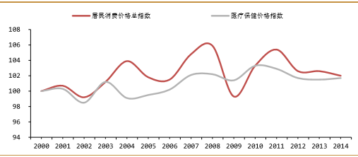 从历史价格的纵向对比来看:政策对于医疗服务价格的政策调控过于滞后,行业研究2000年以来的大多数时候,医疗保健消费的价格指数都是低于居民消费价格指数的。即使在通货膨胀或者各种物资普遍上调价格的时候,医疗服务价格也并未随各种原材料价格的上涨而升高,未体现医护人员的收入也要随之上涨及各种原材料价格上涨等因素对医院日常运行的影响。