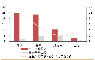 与服务终端价值背离现象相对应的是公立医院陈旧的人力资源系统。中国公立医院现行人力资源管理制度沿袭了旧计划经济体制下的“普遍低工资”。根据2012年的调研数据,上海市的医生平均工资相对香港、美国、新加坡均处于低位,但其超负荷工作量处于逐年递增状态。
