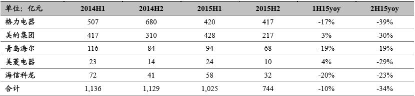 2015 年年报显示,格力电器、美的集团、青岛海尔、海信科龙、美菱电 器的空调收入分别同比下滑 29%、11%、19%、21%、8%,其中下半年 五家上市公司空调业务整体-34%,幅度大于上半年的-10%。如果考虑较 为稳定的外销业务,内销下滑幅度较前述数据更大。