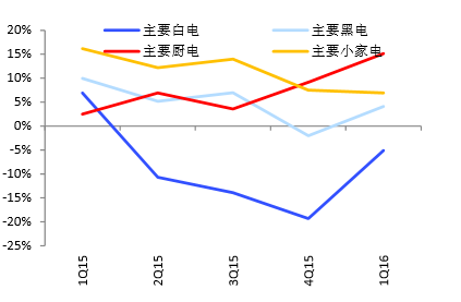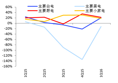 相比家电行业其他子行业,白电收入增速受累于空调“去库存”的影响, 在最近 5 个季度中表现最差,2015Q4 下滑幅度最大,2016Q1 收入降幅 收窄,但是仍旧同比下滑。