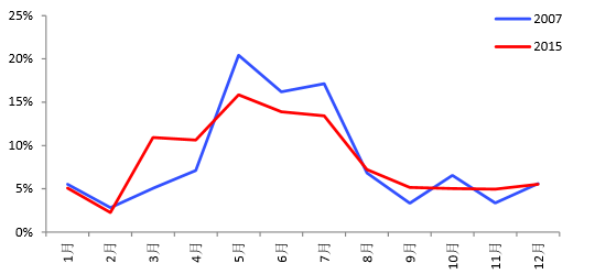 图 1. 2015 年 5-7 月的零售量占比相比 2007 年明显下降