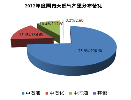我国天然气主要由中石油、中石化、中海油三家公司提供,其中以中石油为主。2012年,中石油的天然气产量约为798.5亿立方米(含6亿立方米地面煤层气产量),占全国天然气总产量的73.9%,同比增长42.3亿立方米,占全国天然气总增量的61.8%;中石化和中海油的天然气产量分别约为166.6亿立方米和112.6亿立方米,分别占全国天然气总产量的15.4%和10.4%。2012年度国内天然气产量分布情况如下图所示: