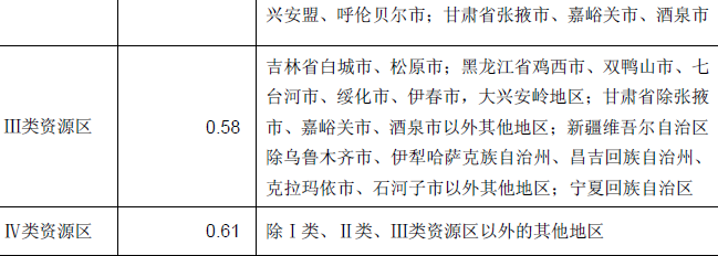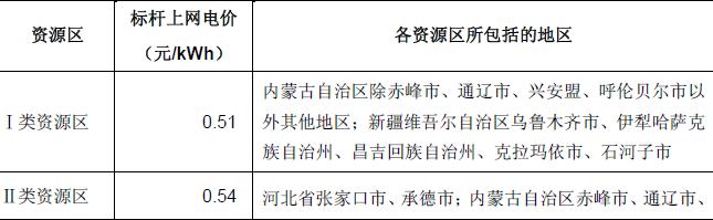 2009年7月,国家发改委发布了《关于完善风力发电上网电价政策的通知》(发改价格[2009]1906号),对风力发电上网电价政策进行了完善。文件规定,全国按风能资源状况和工程建设条件分为四类风能资源区,相应设定风电标杆上网电价。四类风电标杆上网电价水平分别为0.51元/kWh、0.54元/kWh、0.58元/kWh和0.61元/kWh,2009年8月1日起新核准的陆上风电项目,统一执行所在风能资源区的标杆上网电价,海上风电上网电价今后根据建设进程另行制定。政府针对四类风能资源区发布的指导价格为最低限价,实际执行电价由风力发电企业与电网公司签订购电协议确定后,报国家物价主管部门备案。2009年8月1日之前核准的陆上风电项目,上网电价仍按原有规定执行。并继续实行风电价格费用分摊制度,风电上网电价在当地脱硫燃煤机组标杆上网电价以内的部分,由当地省级电网负担;高出部分,通过全国征收的可再生能源电价附加分摊解决。脱硫燃煤机组标杆上网电价调整后,风电上网电价中由当地电网负担的部分要相应调整。全国风力发电标杆上网电价表如下所示: