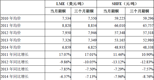 国际精铜的销售价格主要参考LME的铜价确定,国内主要参考上海长江现货市场及SHFE的铜价确定。铜价格走势主要受到国际经济形势、生产国的生产供应状况、下游行业产业政策、替代品价格、库存量等因素的影响,存在明显的周期性。2010年—2014年,LME和SHFE期铜年平均价格及变化如下表:2010-2014年铜价格情况表
