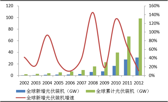 2012年全球新增光伏装机达31GW,相对于2011年27.9GW增长11%,累计装机量达到98.5GW,新增装机增速跌入低谷。光伏行业受政策补贴驱动的性质没有改变,行业发展呈现出巨大的波动性。2012年全球光伏主要市场深陷债务危机,补贴不断下调,装机需求增速大跌,全产业链上产品价格均大幅跳水。