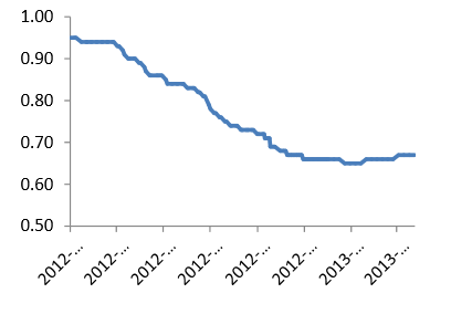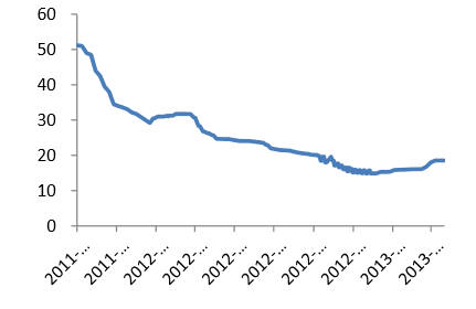 光伏级多晶硅均价自2012年初的30美元下跌至年末的15美元左右,价格跌去一半。光伏组件价格从0.95美元跌至0.65美元,价格跌幅超过30%,企业经营情况急剧恶化。