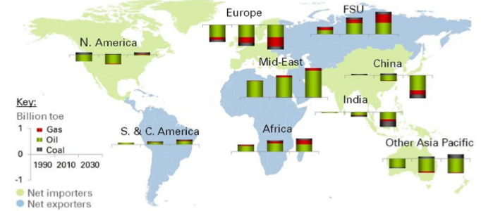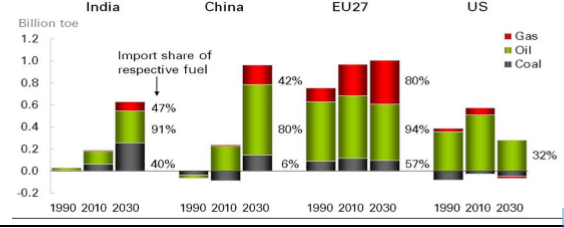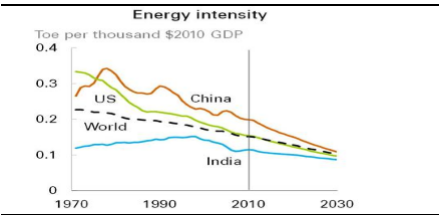 中国近30年的粗放发展模式中,单位产值的能耗水平一直居高不小。2010年我国单位GDP能耗是美国的2.5倍,日本的4.5倍,是世界平均水平的2倍。另一方面,我国主要化石能源石油和天然气都需要进口。英国石油BP预计,2030年前后,中国将成为能源供需缺口最大的国家之一。