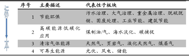 按照不同的发展阶段,我们将能源利用简单地分为节能环保、高碳能源低碳化应用、清洁气体能源和可再生能源等四个不同的阶段。节能环保特别是环境治理板块,属于事后补救的措施,更多地被我们赋以“治标”属性。由“治标”往“治本”的过渡中,我们更多地看到了“高碳能源低碳化应用”和“清洁气体能源”的应用。长期来看,它们都是过渡性解决方案,因为不管怎样,化石能源终将灰飞烟灭。其中,高碳能源的低碳化应用由于技术问题,一度不受重视。但是,我们认为随着碳捕捉技术的逐步完善,随着海水淡化解决“煤化工”水源的问题,这些过渡性的技术作为有力补充也将登上人类能源利用的历史舞台。最后,能源利用的最高级阶段是“治本”的可再生能源。在人类有限的历史中,我们或许看不到太阳能枯竭的一天。