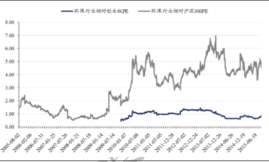 可以看出,目前环保板块估值相对历史均值处于一个较高水平,但较创业板相对估值较低;较沪深300沪指较历史平均水平仍然较高。