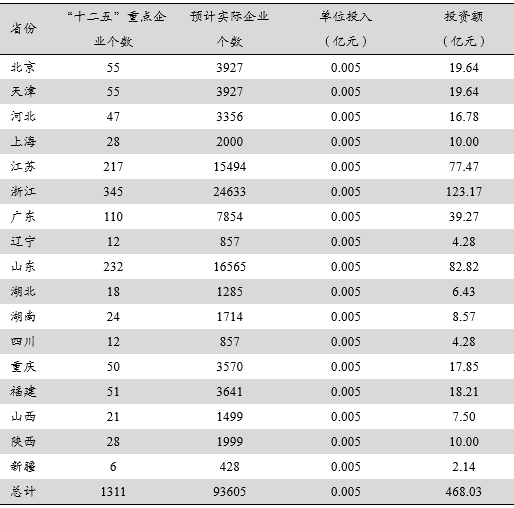 上海补贴方式为范本,促进企业监测设备采购污染源监测方面,按照此前根据《重点区域大气污染防治“十二五”规划重点工程项目》对于全国共计1311个VOCs重点治理企业,以及上海市进行的补贴范围面向的企业数量(重点治理企业28个,补贴企业2000个)比例来估算,VOCs监测设备在污染源端有望实现最高9.36万台。按照污染源单套监测设备50万元估算,市场空间将达468亿元。