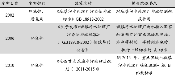 自GB18918-2002标准发布以来,我国的城镇污水处理厂先后进行了3次提标改造:第一次为GB18918-2002标准发布实施后的提标改造;第二次为2006年发布标准修改单,要求城镇污水处理厂出水排入国家和省确定的重点流域及湖泊、水库等封闭、半封闭水域时,执行一级标准的A标准;第三次是《全国重点流域水污染防治规划(20112015)》要求,到2015年,重点流域内城镇污水处理厂确保达到一级B排放标准。