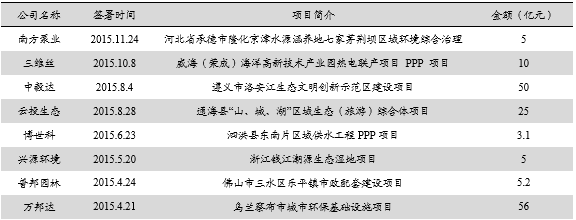 在环境治理压力和资金瓶颈的矛盾面前,PPP模式应运而生。2013年12月的中央城镇化工作会议明确提出放宽市场准入,制定非公有制企业进入特许经营领域的办法,鼓励社会资本参与城市公用设施投资运营;2014年9月出台的《关于加强地方政府性债务管理的意见》(43号文)更是首次为PPP指出了一条可行性道路。2015年是PPP大力发展的一年,多家环保类上市公司借助政策春风都签订了大金额的生态环保类PPP项目合同,订单总金额超过500亿元。