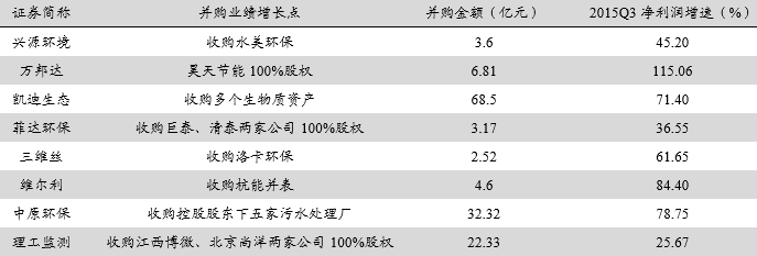 凭借着较高的毛利率和盈利能力,环保行业不断吸引其他领域的企业进入;而行业竞争激烈也致使小型环保企业生存艰难,通过投靠大企业来维持成长,行业内并购频出。通过收购其他类的环保公司(多为规模较小企业)横向拓展细分产业链,或原主营业务非环保的公司通过收购典型的环保公司大举向环保行业扩张,企业不仅实现在资源和资金上实现互补,而且还可以通过业务上的协同实现平台和资源的共享,为发展打下更好的空间。收购环保类公司,尤其是通过重大资产重组收购后基本面发声重大变化的企业,市场关注度往往会增高,且伴随公司环保新业绩的不断释放,估值带来的高估值效应有望持续。