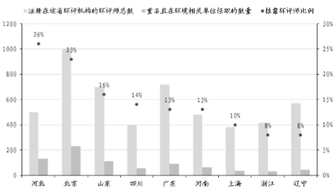 根据南方周末2014年10月对全国数量居前的9个省份(河北、北京、山东、四川、广东、河南、上海、浙江、辽宁)共5349名环评师逐一核对,供职在环境相关单位的重名的环评师共有834人,挂靠比率高达15.59%。考虑到具有环评师资格但不在环境相关单位的人员(如在国企、高校等任职)挂靠情况,该比例实际上将会更高。
