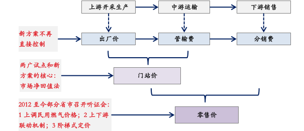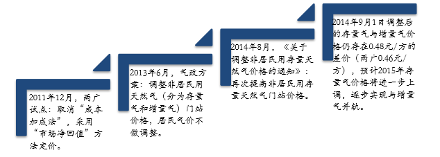 2011年,在广东、广西开展天然气价格形成机制改革试点,取消“成本加成法”,采用“市场净回值”方法定价,即将天然气价格与市场化的替代品价格挂钩后,再扣除管道运输费后价格。这是中国探索天然气市场化定价的开端。