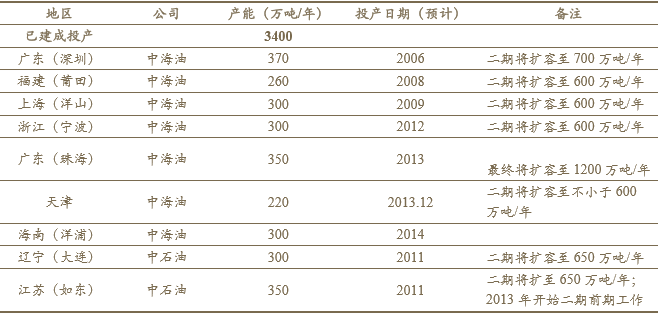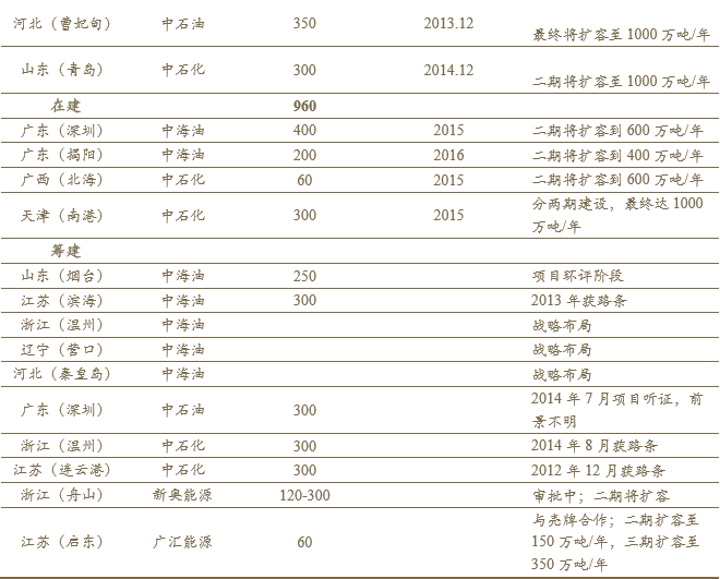 从LNG接收站看,海气登陆,进口LNG和近海天然气优先供应沿海地区。国内目前投入运营的LNG接受终端有广东大嶝岛、福建莆田、辽宁大连、山东青岛等11个,合计吞吐能力为3400万吨;此外还有4个在建项目预计到2016年陆续达产,合计新增吞吐能力为960万吨。已投入运营的11个接收站中7个归属中海油,3个归属中石油昆仑能源,1个归属中石化。这些接收站主要用途是接纳远洋LNG运输船,并给城市管网供气。