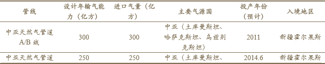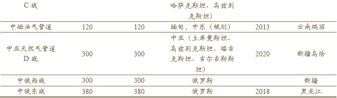 从管道天然气管线看,目前我国天然气进口管道主要是中亚天然气管道A/B/C线和中缅油气管道。今年5月21日,《中俄东线供气购销合同》在沪签署,9月1日,中俄东线天然气管道俄境内段“西伯利亚力量”管道开工,11月9日,中石油又与俄罗斯天然气工业股份公司签署了《关于沿西线管道从俄罗斯向中国供应天然气的框架协议》,西线在年底前也有望达成协议。这意味着继海上LNG进口、中亚天然气管线、中缅天然气管线之后,中俄天然气线路将成为中国第四大天然气进口来源。随着中俄天然气管道东线的建成,我国将形成西北、西南、东北天然气管道进口,东部沿海LNG进口的天然气多元供应局面。