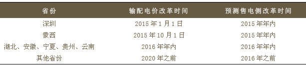 根据目前的改革进展情况,我们预测,售电侧改革并不会在全国范围内迅速开展,我们预计限期仍旧以试点为主,目前云南、安徽、湖北、宁夏和贵州五省已经上报输配电价改革实施方案,我们预计方案获批之后,这五个省份将成为下一批进行售电侧改革的地区,时间预计在2016年年内。