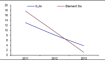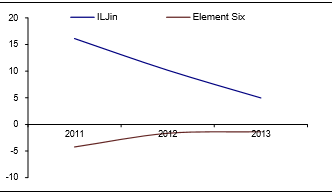 韩国日进金刚石税前毛利率远远高于元素六公司,但是平均净利率略低于元素六公司,元素六公司2012年净利率水平为9.49%,2013年下降幅度大,净利率水平为1.17%。