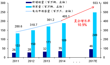 (1)电动自行车新增量与保有量稳定增长,预计2014-2017年动力电池市场需求复合增长率为10.9%;