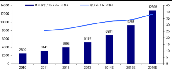 根据《碳纳米管的千吨级产业化可行性探讨》预计到2016年,碳纳米管市场规模将达到11亿美元,年复合增长率(2010-2016)为10.3%。2016年,碳纳米管的产能将达到12806吨,年复合增长率(2010-2016)超过30%。