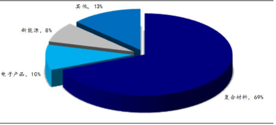 2013年全球碳纳米管应用领域中,复合材料占绝对优势,达69%。其次是电子产品和新能源领域,除此之外其他领域合计13%。