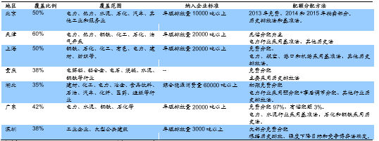 各试点碳市场重点覆盖减排潜力大、能力强的大型企业,主要包括电力、热力、水泥、钢铁、石化等高排放行业。