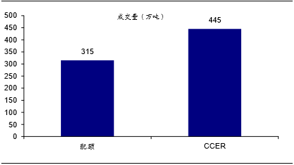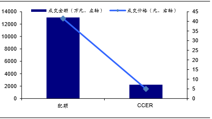 CCER价格大幅低于配额价格,主要源于:1)CCER供给较大;2)CCER市场尚不成熟,大部分为协议转让交易,价格透明度差。