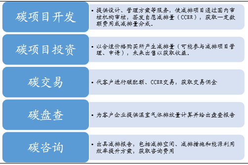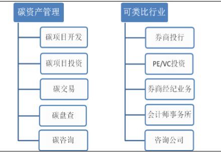 目前国内碳资产管理产业链主要包括:碳项目开发、碳项目投资、碳交易、碳盘查、碳咨询等。可类比行业为券商投行、PE/VC投资、券商经纪业务、会计师事务所和咨询公司。