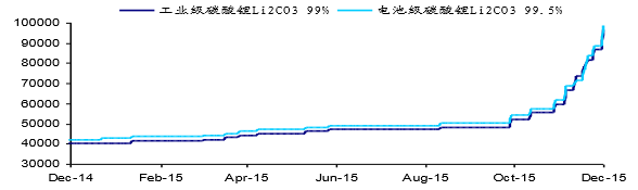 进入11月份,碳酸锂价格加速上涨,这是由于目前碳酸锂库存极低,新能源汽车销量持续超预期(2015年1-11月,新能源汽车累计生产27.92万辆,同比增长4倍),需求端依然紧俏所致。截至2015年12月15日,工业级碳酸锂价格96600元/吨,电池级碳酸锂价格98600元/吨。