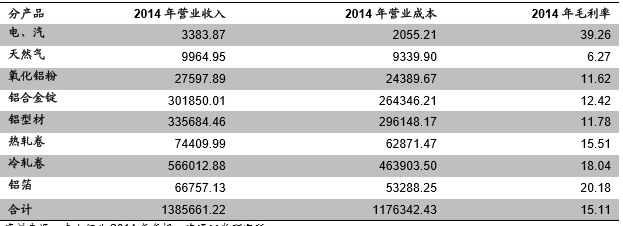 南山铝业股份有限公司主营业务财务情况(单位:万元)