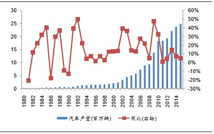 近年来,我国汽车工业发展迅速,汽车产量增长迅速,由1980年的22万辆汽车增长为2015年度的2484万辆,34年间年复合增长率达到14.88%。但与发达国家相比,我国汽车保有量较低,后续需求有望持续放量。据《2015年国民经济和社会发展统计公报》显示,2015年末全国民用汽车保有量达到17228万辆(包括三轮汽车和低速货车955万辆);国家统计局数据显示,我国2015年总人口达到13.75亿人,根据这两个数据可计算得到2015年我国汽车的千人保有量达到125.29辆/千人,远远低于成熟市场国家(根据世界银行提供的数据,德国、法国、日本、英国和美国在2011年汽车千人保有量分别达到530.96、482.17、454.86、453.70和403.27辆)。