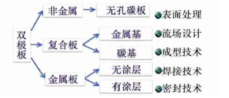 成水,从功能上要求双极板材料是电与热的良导体、具有一定的强度以及气体致密性等;稳定性方面要求双极板在燃料电池酸性(pH=2~3)、电位(E=~1.1V)、湿热(气水两相流,~80℃)环境下具有耐腐蚀性且对燃料电池其他部件与材料的相容无污染性;产品化方面要求双极板材料要易于加工、成本低廉。