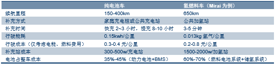 纯电动车和氢燃料电池车参数比较