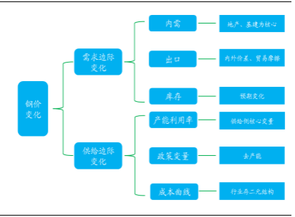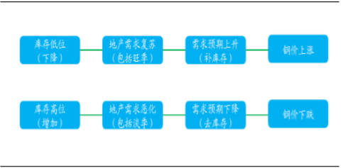 短期钢价传导机制研究。在短期,我们假设供给端,尤其是产能利用率、政策及行业成本结构不发生变化的情况下,影响钢价短期变化的因素主要在需求端。而需求端来看,在出口规模一定的情况下,内需的波动包括季节性的波动是影响钢价短期最核心的因素,而内需中,地产是最核心的影响因素,而库存则主要影响传导幅度。我们给出钢价反弹及下跌的路径:库存低位(下降)—地产需求复苏(包括旺季)—需求预期上升补库存—钢价上涨;库存高位(增加)-地产需求复苏结束或恶化(包括淡季)—需求预期下降去库存—钢价下跌。当然,强劲的地产复苏或恶化会超越库存周期。