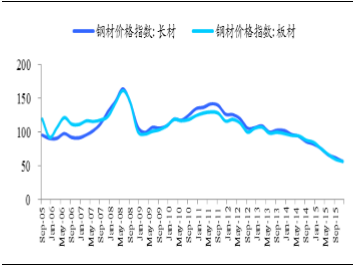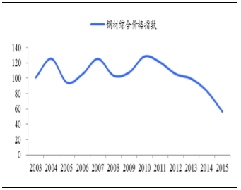我国钢材价格自2011年起连续四年下滑,2015年呈现加速下滑态势。钢材综合价格指数由年初的81.91下降到56.37点,降幅31.1%,市场供大于求的局面持续恶化。