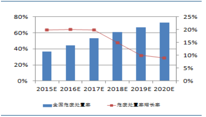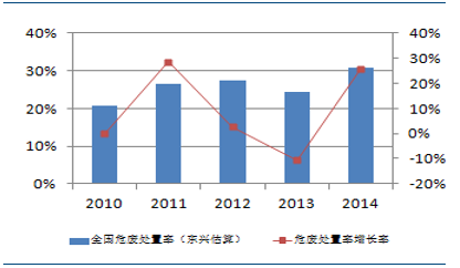 由近年危废处臵率变化图可以看出在2014年处臵率有了明显上扬,同比增长率超过20%。在天津港以及常州事件的催化下,随着相关政策法规进一步完善以及行业监管的加强,危废市场空间将会得到快速弥补。我们预计最近两年危废处臵率增长率将保持在20%左右,整个“十三五”期间年复合增长率约15%,到2020年处臵率将达到73%。假设新增处臵空间资源化与无害化各占50%的话,以资源化2000元/吨,无害化3000元/吨的收入计算,市场增量空间将在1075亿元。