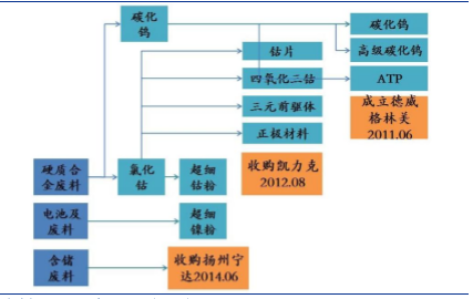 格林美是国内最大的小电池回收企业,后端多金属综合循环利用已渐入佳境。格林美以超细钴镍粉再制造起家,已经是中国最大规模的小型电池回收企业,每年处理各种废旧电池在2万吨以上,荆门基地已形成2000吨超细钴粉、1300吨超细镍粉产能,产销规模均为国内第一。此前通过收购德威格林美和扬州宁达,还获得了碳化钨制造、锗金属回收业务,预计未来将进一步向稀土等稀贵金属资源回收拓展。