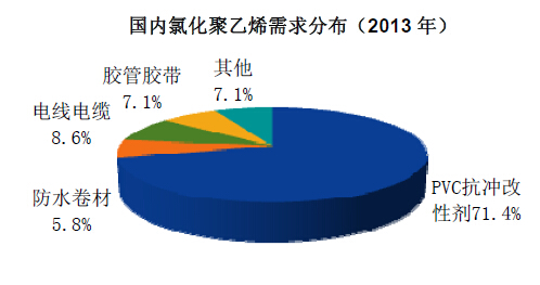 近年来,随着下游行业不断发展,对氯化聚乙烯需求量持续拉升,推动氯化聚乙烯产量持续增加,根据中为咨询研究报告预计2015年国内氯化聚乙烯消费量将达到85万吨/年。目前我国已成为全球氯化聚乙烯第一大消费国。在国内消费中,72%左右的氯化聚乙烯仍用于传统的PVC的改性,在防水卷材、电线电缆、胶管胶带等其他方面需求量占28%左右。国内氯化聚乙烯需求分布(2013年)