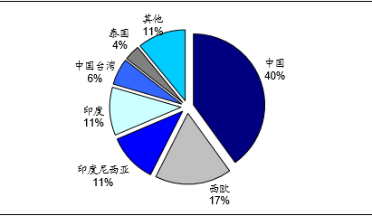 自上世纪90年代开始粘胶产能的增长主要集中在亚洲地区的中国、台湾、韩国,而欧美日等发达国家侧重于通过技术升级研发新产品、提高差别化率和增加附加效益。据统计2005年我国粘胶短纤产量已达89.7万吨,占世界总产量的40%为全球第一;截至2015年我国粘胶短纤总产能占全球比例已高达66%,远远领先于其他国家。