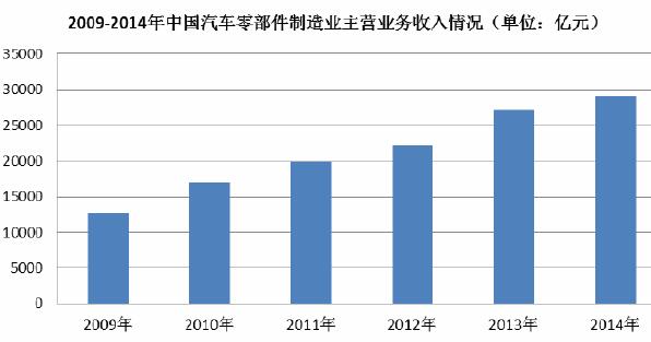 近年来,在国家产业政策和汽车行业高速增长的推动下,我国汽车零部件企业的技术水平和生产管理水平得到很大提高,汽车零部件行业规模迅速扩大,2014年,汽车零部件制造业(规模以上企业)主营业务收入累计2.91万亿元,行业利润总额2,149.7亿元,同比增长16.12%。