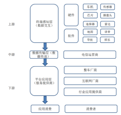 智能汽车产业链。包括上游终端感知层,中游数据传输层,下游平台应用层和消费者。上游的终端感知层主要包括硬件和软件两大部分。其中硬件有车机、传感器、RFID、智能芯片、雷达、摄像头、车载电池等;软件包括人工智能操作系统、车机操作系统、导航、语音、娱乐、地图等。