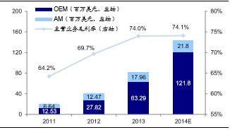 Mobileye经营状况不断向好,研发支出平稳,表明了前期投入已逐渐获得回报。2011-2014年间,公司主营业务收入增长迅速,年复合增长率高达94%,毛利率水平也稳重有升,达到70%以上的高水平。主营业务中,OEM前装业务收入占比从65%上升至87%,收入从1250万美元快速上升至1.22亿美元,年增速超过100%,增长势头迅猛。由于公司属于轻资产型的科技公司,研发支出是总费用中的重头,如中国区子公司的研发费用占总费用比率已达到90%以上。2011-2014年,公司研发支出保持在1500-2000万美元的相对稳定水平,其中前装OEM业务的研发支出占比80%以上,是主要支出源头。但与此同时,营业收入增长明显,研发支出对营业收入的比例大幅下降,表明了前期研发投入已逐渐加入回报期。