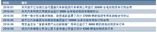 2016年至今电动物流车订单已超9万辆。截至目前,新能源汽车厂商共签约订单及框架协议共计超过9万余量,这一数字是2015年全年电动物流车产量的1.9倍。这些订单为今年下半年电动物流车的产量的大幅度提升提供了有力保障,同时这表明了市场对物流车进入补贴名单的强烈信心。预计随着七八月份相关政策逐步落定,电动物流车的产销量在下半年会得到完全释放。