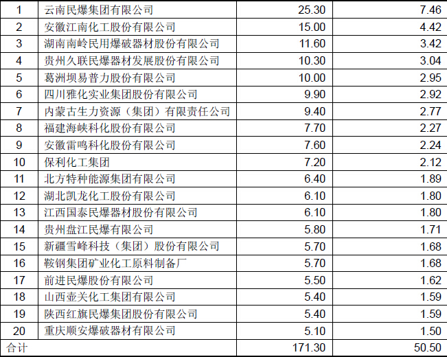 2013年民爆企业生产总值前20名,单位:亿元,%